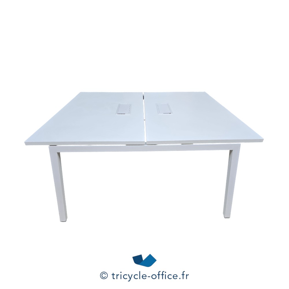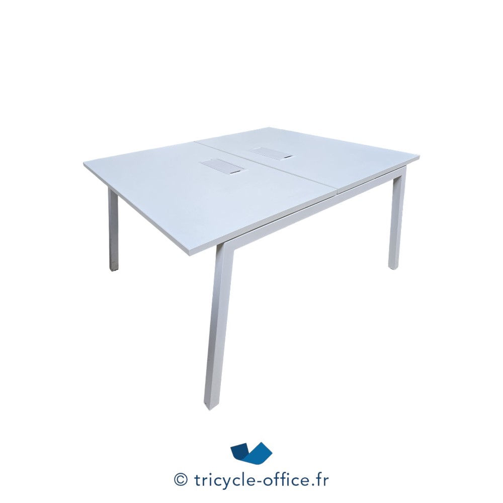 Ce poste de travail double dispose de deux plateaux blancs séparés équipés de passe-câbles intégrés, facilitant l’organisation des fils et l’installation du matériel informatique.